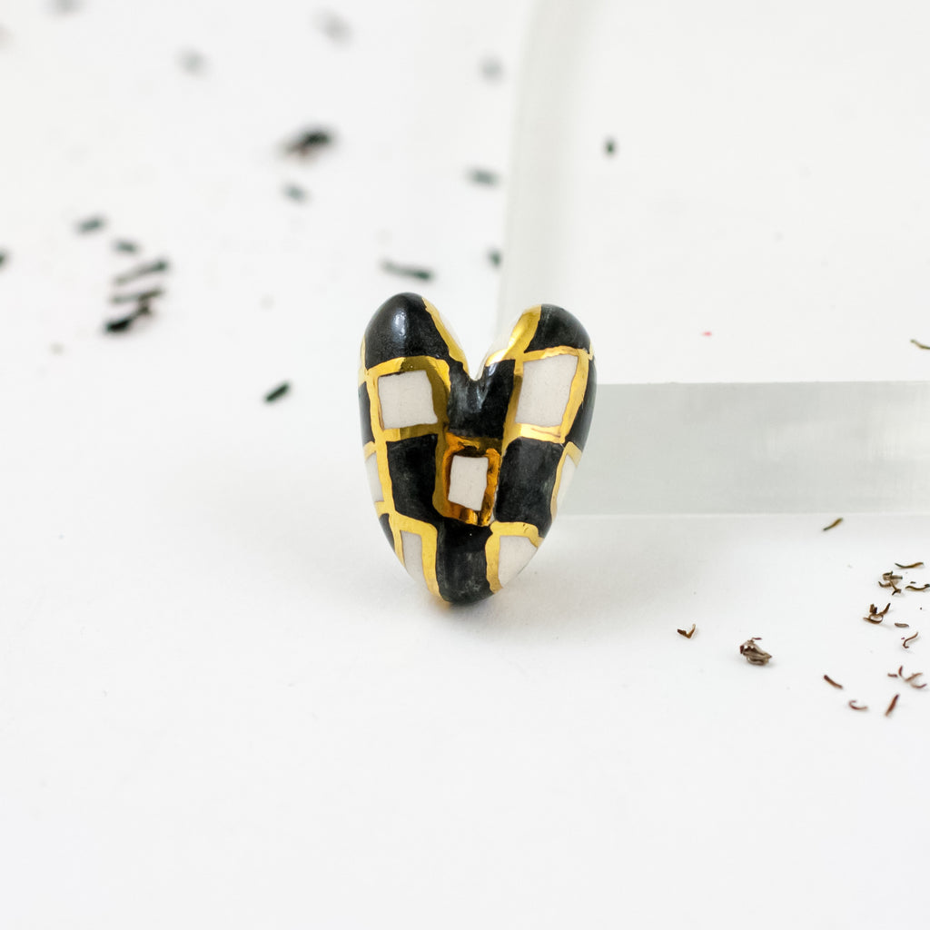 Black and white heart-shaped brooch with gold luster – Aiste Jewelry