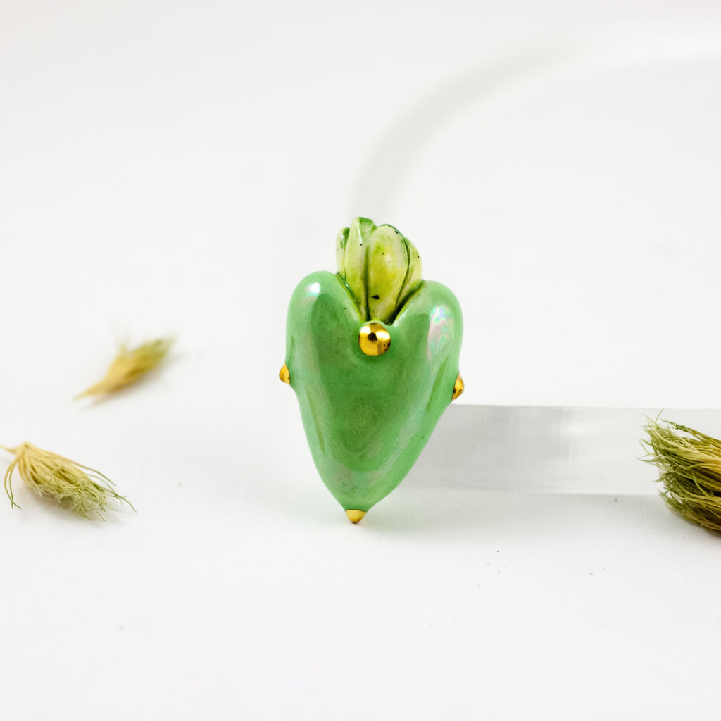 Šviesiai žalios spalvos širdelės formos keraminė sagė su perlo blizgesiu