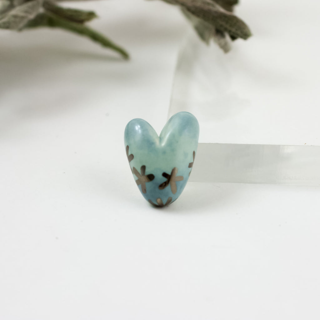 Švelniai mėlyna širdelės formos sagė su platinos blizgesio gėlėmis