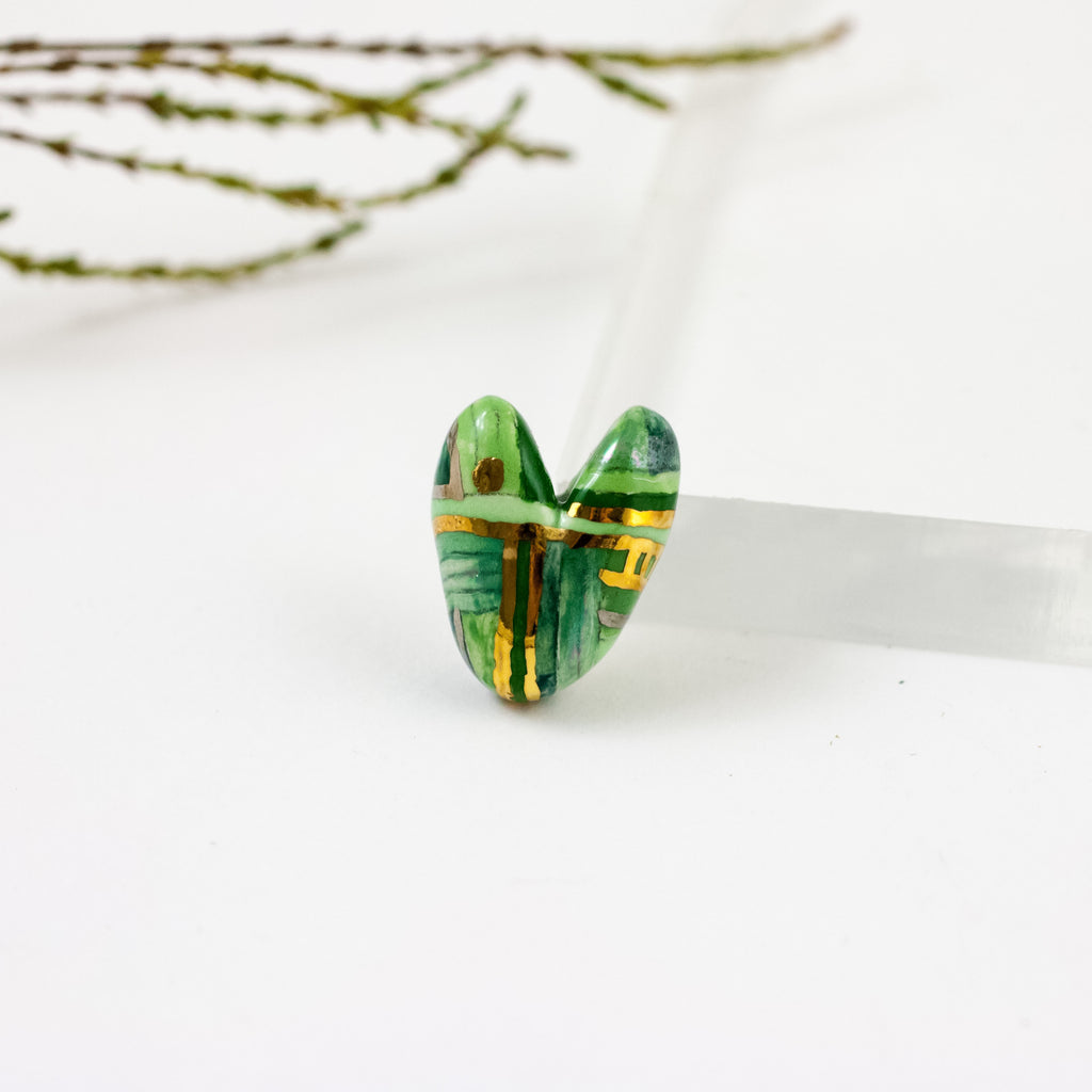 Dryžuota žalia širdelės formos sagė su liustrais