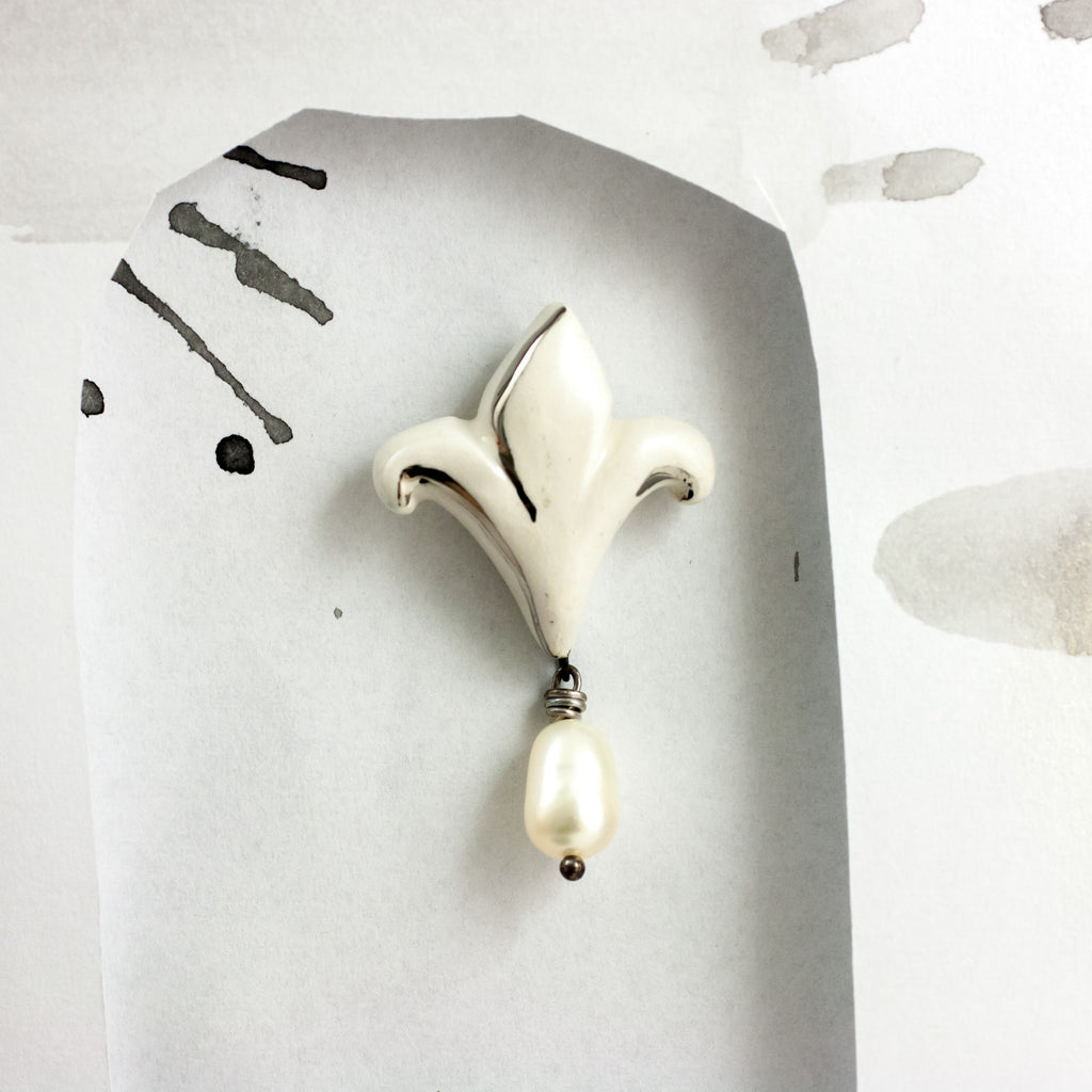 Balta ir platininė spalvos sagė su gėlo vandens perlu