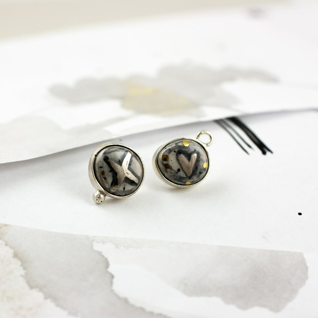 Grey and white ceramics earrings decorated with tiny platinum symbols - a heart and a star. Playful and glittered with gold and pearl lusters, lifting your spirit, inviting you to smile - after all, they're made to make you happy.