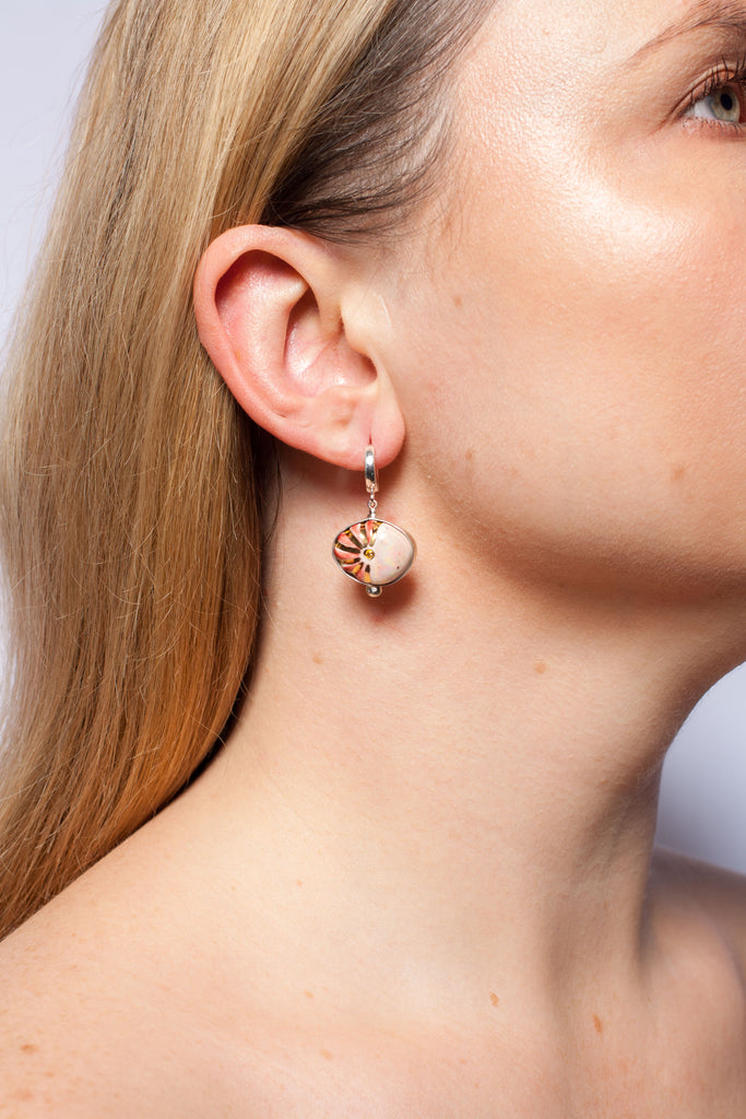 Handmade in white clay pottery. Triple fired in the kiln, decorated with a shimmering gold luster finish. Comfortable English silver clasps, a feeling of ease for everyday adornment.