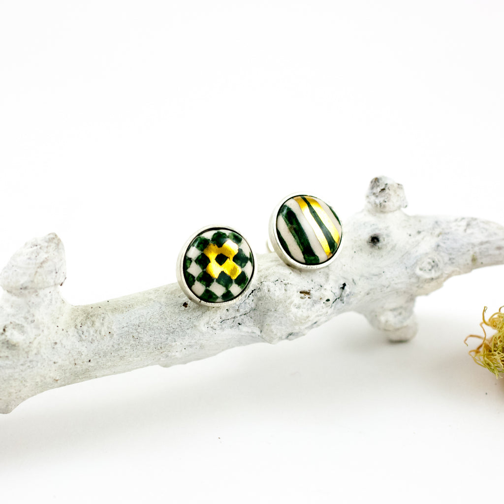 Sterling silver earrings with ceramics. Don't be mistaken - these are not ordinary ones. Made from white clay and carefully decorated with ceramic watercolor, shiny glaze surfaces, and gold details. Fresh-looking minimal design studs are one-of-a-kind accessories.
